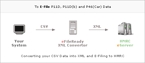 eFileReady's P11D Specialist has gained EXB Internet Recognition by the HMRC. e-Filing of your P11D and the P46(Car) can now be done easily through the www.efileready.com web-based on demand system as the system helps you to convert your P11D and the P46(Car) data into the HMRC required standard. The Efileready.com server which is capable of converting your spreadsheet/CSV file data into the HMRC required XML format and then e-Filing that data for you.